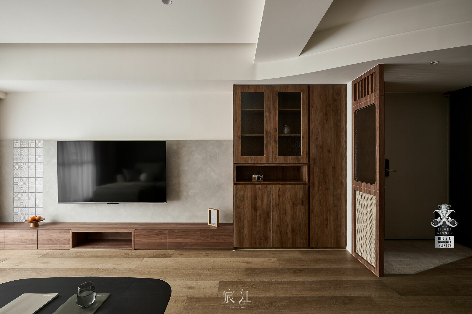 此案為舊屋翻新,為了延續過往的居住回憶,以及⼈與空間的情感連結,因此在櫃體及屏風嵌入壓紋或銀波玻璃,呼應家宅昔⽇的軟裝質感,藤編家具與花磚牆則點綴出⼈⽂復古的氛圍,搭配業主鍾愛的岩板餐桌和胡桃⽊餐椅,在美感與機能之間取得平衡,營造溫潤沉靜的⽣活場景。